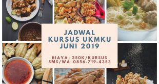Jadwal Kursus Masak UKMKU Mei 2019 Kursus Siomay & Batagor, Sabtu 15 Juni 2019 Kursus Mie Ayam Gerobakan, Minggu 16 Juni 2019 Kursus Bakso Kampoeng, Sabtu 22 Juni 2019 Kursus Dimsum Kaki Lima, Minggu 23 Juni 2019 Kursus Ayam & Bebek Goreng Kremes, Sabtu 29 Juni 2019 Kursus Fried Chicken Gerobakan, Minggu 30 Juni 2019 Pendaftaran : Sms/WA 0856 …