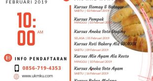 Jadwal Kursus Masak UKMKU Februari 2019 Kursus Siomay & Batagor, Sabtu, 02 Februari 2019 Kursus Pempek, Minggu 03 Februari 2019 Kursus Aneka Soto Daging, Selasa 05 Februari 2019 Kursus Roti Bakery Ala UKMKU, Sabtu 09 Februari 2019 Kursus Mie Ayam Ala Resto, Minggu 10 Februari 2019 Kursus Aneka Soto Ayam, …