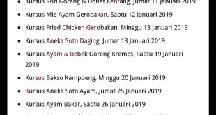 Jadwal Kursus Masak UKMKU Januari 2019 Kursus Siomay & Batagor, Minggu 06 Januari 2019 Kursus Roti Goreng & Donat Kentang, Jumat 11 Januari 2019 Kursus Mie Ayam Gerobakan, Sabtu 12 Januari 2019 Kursus Fried Chicken Gerobakan, Minggu 13 Januari 2019 Kursus Aneka Soto Daging, Jumat 18 Januari 2019 Kursus Ayam …