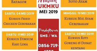 Jadwal Kursus Masak UKMKU Mei 2019 * Kursus Siomay & Batagor, Rabu 01 Mei 2019 * Kursus Fried Chicken Gerobakan, Sabtu 04 Mei 2019 * Kursus Dimsum Kaki Lima, Sebtu 11 Mei 2019 * Kursus Bakso Kampoeng, Minggu 12 Mei 2019 * Kursus Aneka Soto Ayam, Sabtu 18 Mei 2019 * …
