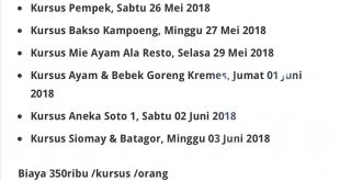 Jadwal Kursus Masak UKMKU 2018 Kursus Pempek, Sabtu 26 Mei 2018 Kursus Bakso Kampoeng, Minggu 27 Mei 2018 Kursus Mie Ayam Ala Resto, Selasa 29 Mei 2018 Kursus Ayam & Bebek Goreng Kremes, Jumat 01 Juni 2018 Kursus Aneka Soto 1, Sabtu 02 Juni 2018 Kursus Siomay & Batagor, Minggu …
