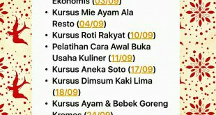 Jadwal Kursus Oktober 2016 Kursus Pempek, Minggu 02 Oktober 2016 Kursus Fried Chicken Gerobakan , Sabtu 08 Oktober 2016 Kursus Siomay & Batagor, Minggu 09 Oktober 2016 Pelatihan Manajemen Keuangan, Manajemen Produksi, Minggu 16 Oktober 2016 Kursus Roti Tawar & Roti Sobek, Sabtu 22 Oktober 2016 Kursus Bakso Kampoeng, Minggu …